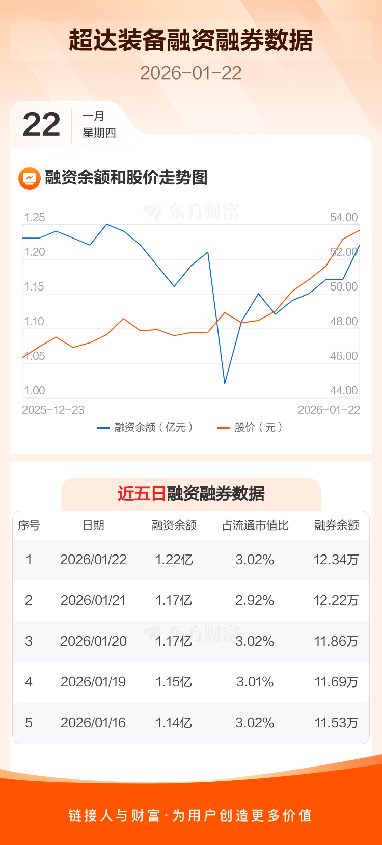 交易所最新数据显示,超达装备于2026年1月22日获融资买入1870.64万元,融资偿还1375.89万元,当日融资净买入494.75万元。目前,该股融资余额1.22亿,占流通市值比例为3.02%。