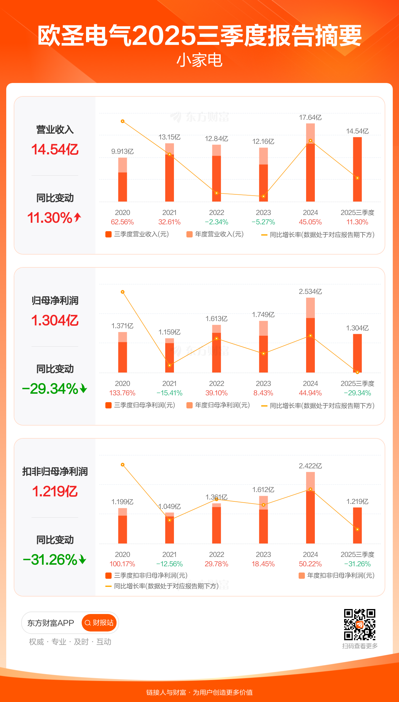 欧圣电气10月28日发布2025年三季报显示,公司前三季实现营业收入14.54亿元,同比增长11.30%;归母净利润1.30亿元,同比下滑29.34%;扣非归母净利润1.22亿元,同比下滑31.26%。