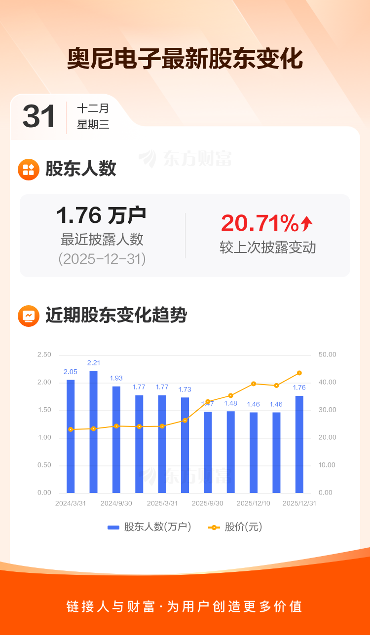 奥尼电子:截至12月31日最新股东户数1.76万户,较上期增加20.71%