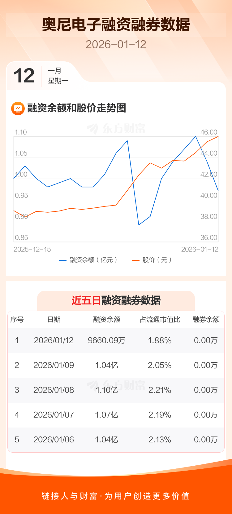 交易所最新数据显示,奥尼电子于2026年1月12日获融资买入1090.64万元,融资偿还1841.59万元,当日融资净偿还750.95万元。目前,该股融资余额9660.09万,占流通市值比例为1.88%。