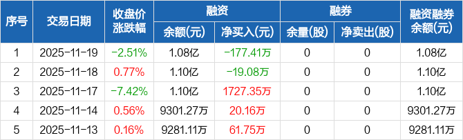 融资方面,当日融资买入560.66万元,融资偿还738.07万元,融资净偿还177.41万元。融券方面,融券卖出0股,融券偿还0股,融券余量0股,融券余额0元。融资融券余额合计1.08亿元。