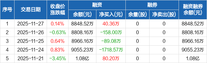 迈赫股份:融资净买入40.36万元,融资余额8848.52万元(11-27)