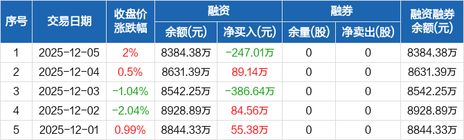 迈赫股份:融资净偿还247.01万元,融资余额8384.38万元(12-05)