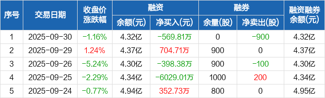 大族数控:融资净偿还569.81万元,融资余额4.32亿元(09-30)