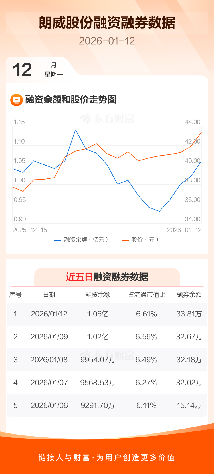 交易所最新数据显示,朗威股份于2026年1月12日获融资买入1850.88万元,融资偿还1418.12万元,当日融资净买入432.75万元。目前,该股融资余额1.06亿,占流通市值比例为6.61%。