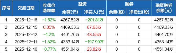 国泰环保:融资净偿还201.81万元,融资余额4267.52万元(12-16)