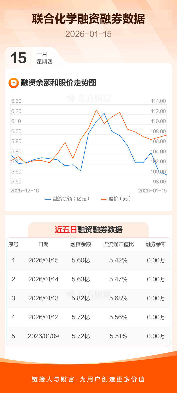 交易所最新数据显示,联合化学于2026年1月15日获融资买入810.26万元,融资偿还1100.78万元,当日融资净偿还290.53万元。目前,该股融资余额5.60亿,占流通市值比例为5.42%。