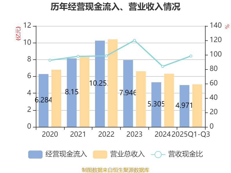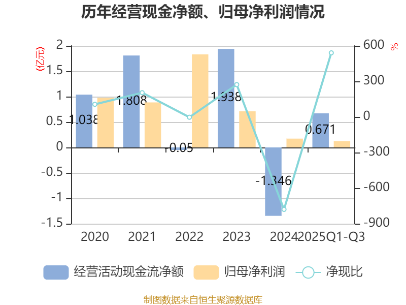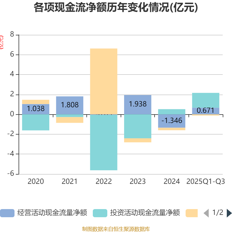 2025年前三季度,公司经营活动现金流净额为6706.33万元,同比增加1.84亿元;筹资活动现金流净额-1211.56万元,同比增加472.44万元;投资活动现金流净额1.49亿元,上年同期为1.18亿元。