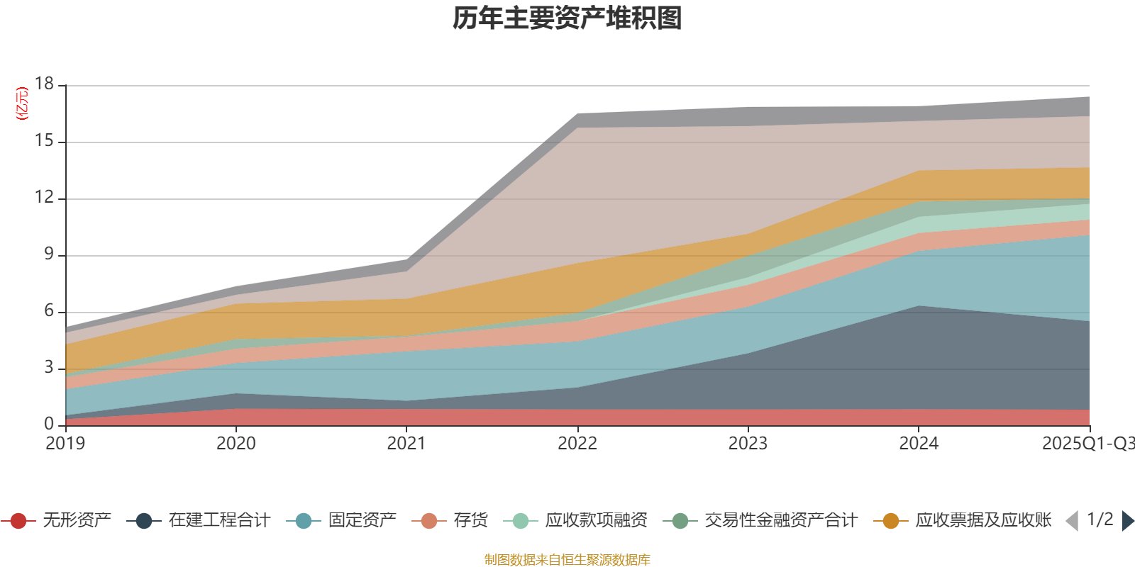资产重大变化方面,截至2025年三季度末,公司固定资产较上年末增加57.37%,占公司总资产比重上升9.07个百分点;在建工程合计较上年末减少14.75%,占公司总资产比重下降5.58个百分点;交易性金融资产合计较上年末减少63.01%,占公司总资产比重下降3.06个百分点;存货较上年末减少14.17%,占公司总资产比重下降0.94个百分点。