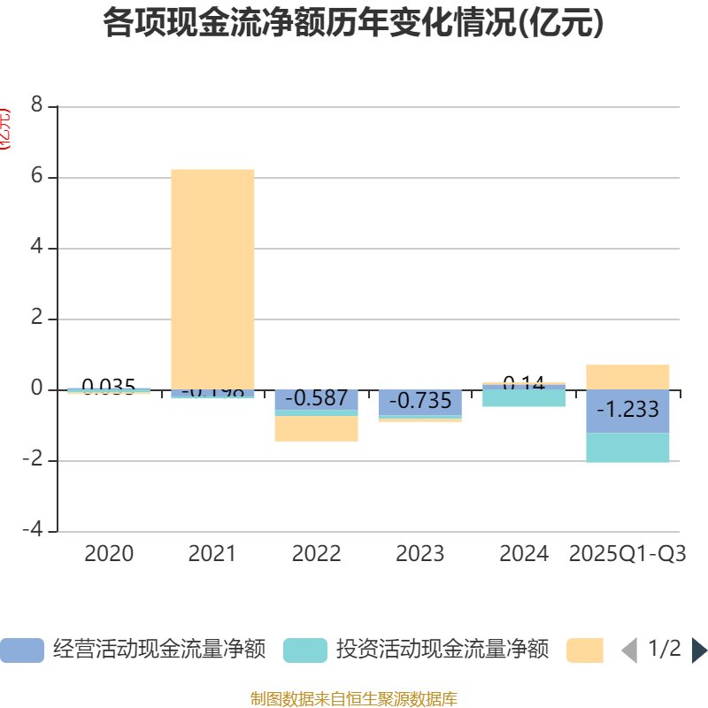 2025年前三季度,公司经营活动现金流净额为-1.23亿元,同比减少7822.91万元;筹资活动现金流净额6988.63万元,同比增加5849.69万元;投资活动现金流净额-8328.31万元,上年同期为-6014.93万元。