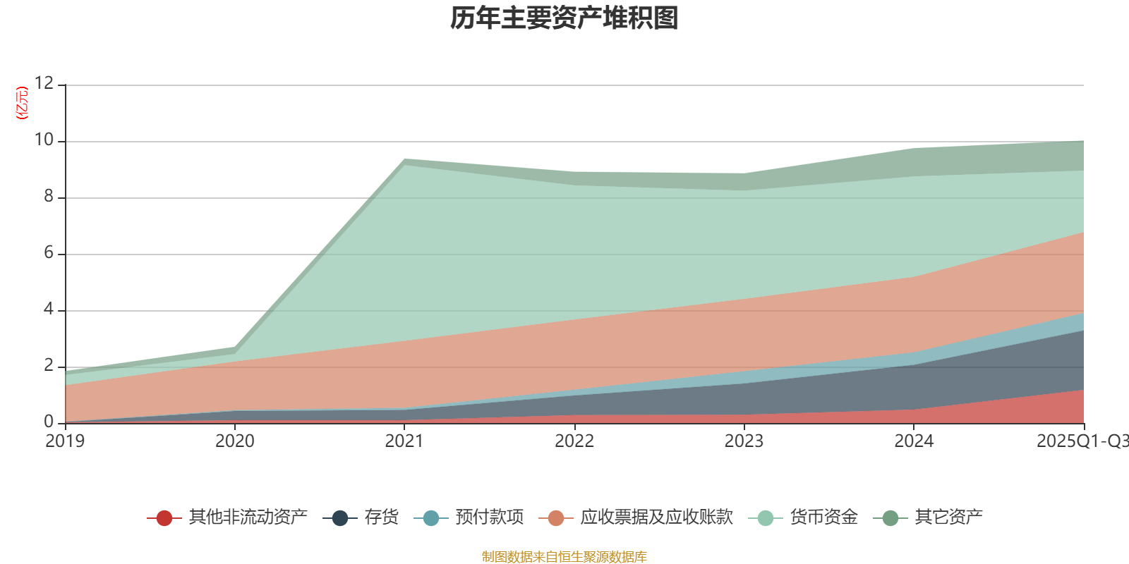 资产重大变化方面,截至2025年三季度末,公司货币资金较上年末减少38.74%,占公司总资产比重下降14.78个百分点;其他非流动资产较上年末增加146.45%,占公司总资产比重上升6.83个百分点;存货较上年末增加33.2%,占公司总资产比重上升4.82个百分点;预付款项较上年末增加39.07%,占公司总资产比重上升1.62个百分点。