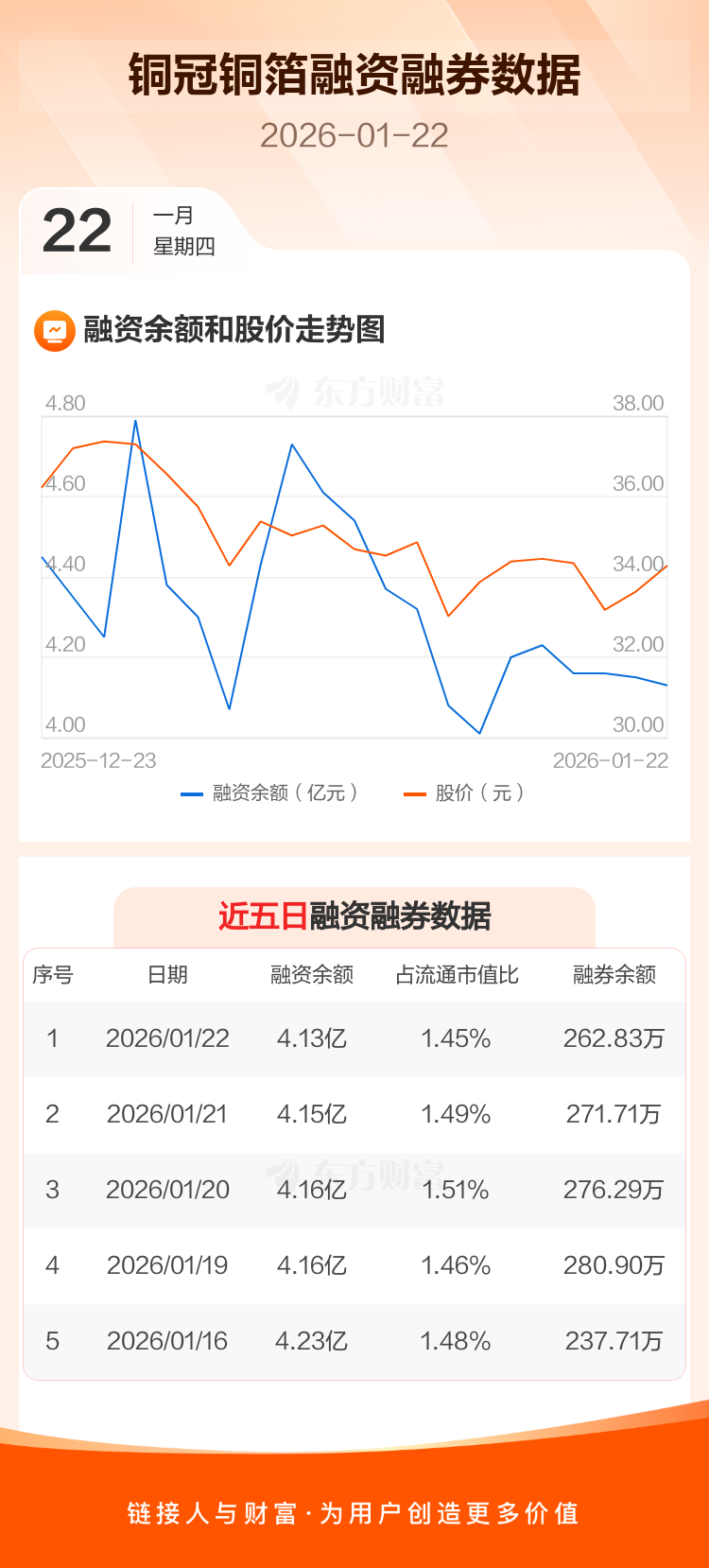交易所最新数据显示,铜冠铜箔于2026年1月22日获融资买入6357.76万元,融资偿还6536.43万元,当日融资净偿还178.66万元。目前,该股融资余额4.13亿,占流通市值比例为1.45%。