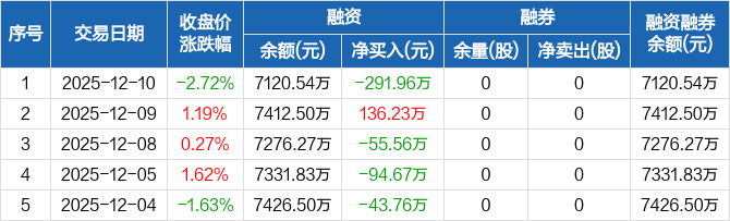 浙江恒威:融资净偿还291.96万元,融资余额7120.54万元(12-10)