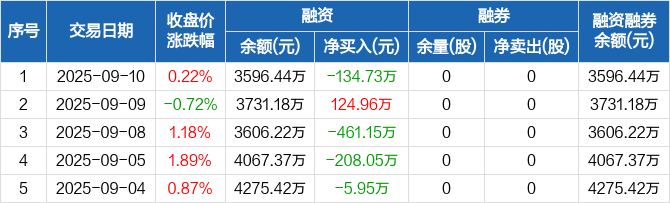 中荣股份:融资净偿还134.73万元,融资余额3596.44万元(09-10)