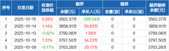 中荣股份:融资净偿还295.54万元,融资余额3563.37万元(10-15)