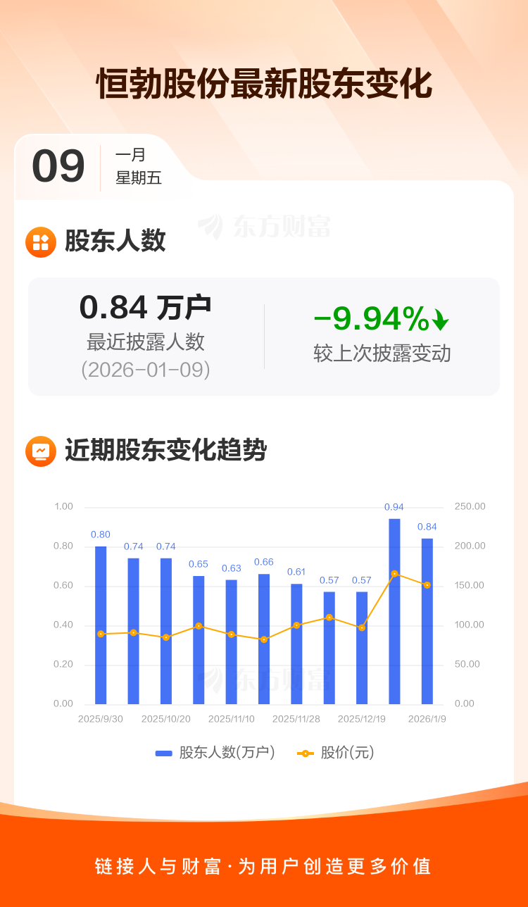 恒勃股份最新披露数据显示,截至1月9日公司股东户数为8446户,较上期(2025年12月31日)减少932户,降幅为9.94%。户均持有流通股数量由上期的3186股上升至3538股,户均持股金额由上期的52.73万元增加至53.42万元。