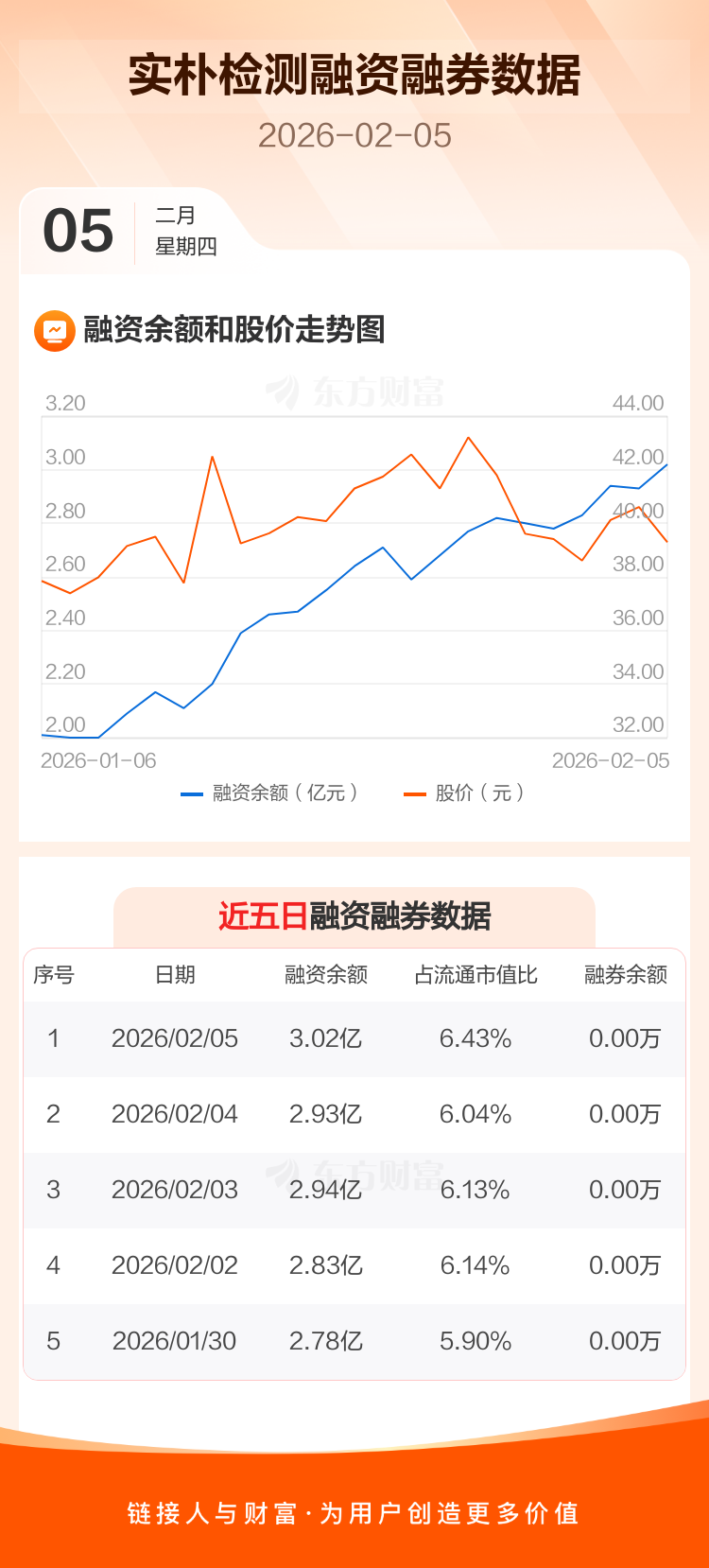 交易所最新数据显示,实朴检测于2026年2月5日获融资买入1430.97万元,融资偿还560.71万元,当日融资净买入870.26万元。目前,该股融资余额3.02亿,占流通市值比例为6.43%。
