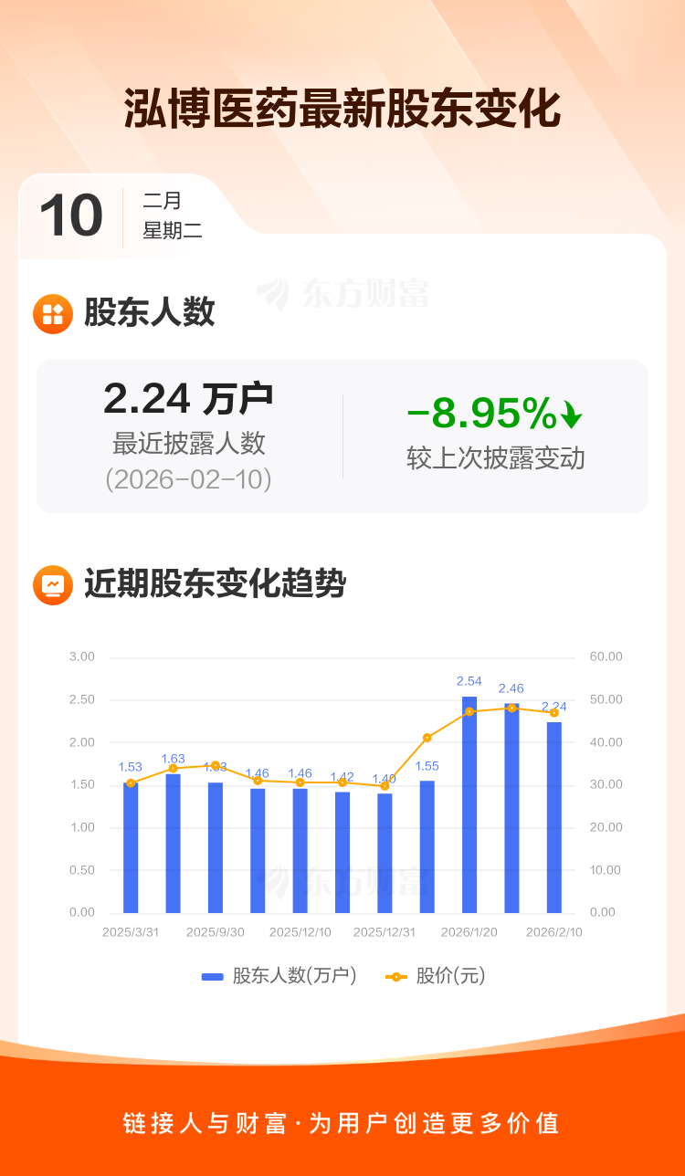 泓博医药:截至2月10日最新股东户数2.24万户,较上期减少8.95%