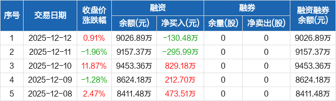 五洲医疗:融资净偿还130.48万元,融资余额9026.89万元(12-12)