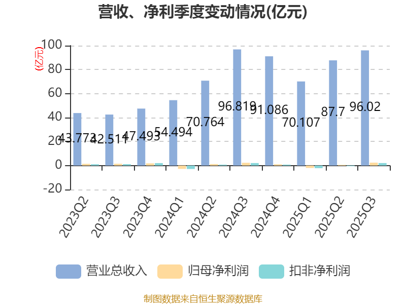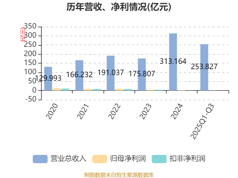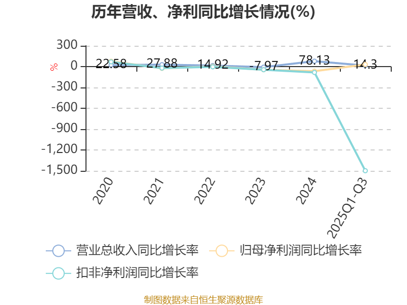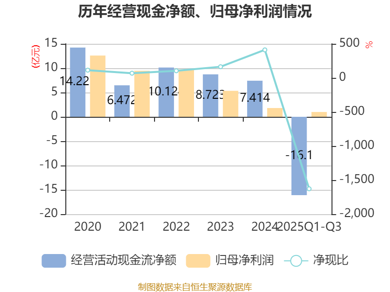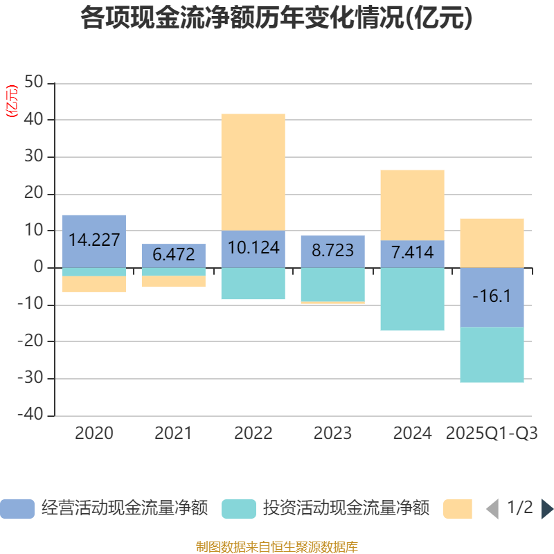 2025年前三季度,公司经营活动现金流净额为-16.1亿元,同比减少8.4亿元;筹资活动现金流净额13.3亿元,同比减少6.55亿元;投资活动现金流净额-14.98亿元,上年同期为-25.27亿元。
