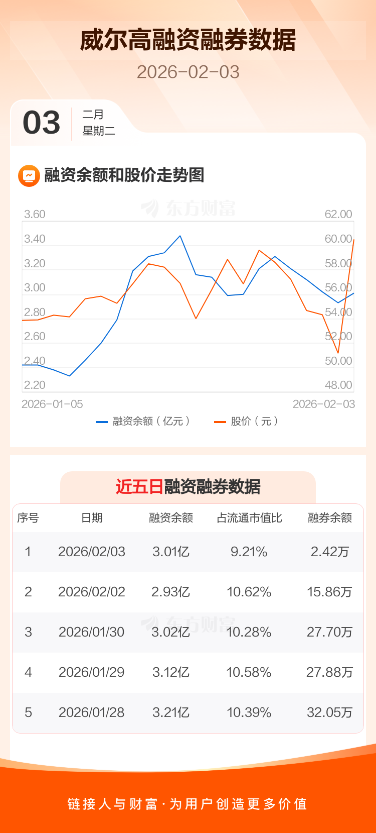 交易所最新数据显示,威尔高于2026年2月3日获融资买入9393.86万元,融资偿还8639.97万元,当日融资净买入753.89万元。目前,该股融资余额3.01亿,占流通市值比例为9.21%。