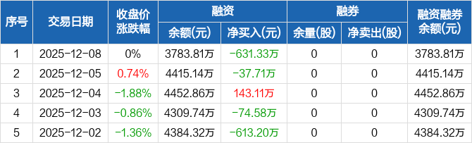 普蕊斯:融资余额3783.81万元,创近一年新低(12-08)