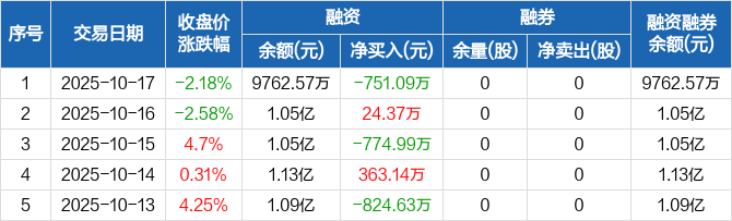 宇邦新材:融资净偿还751.09万元,融资余额9762.57万元(10-17)
