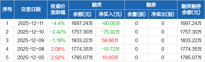 瑞晨环保:融资净偿还60.06万元,融资余额1697.24万元(12-11)