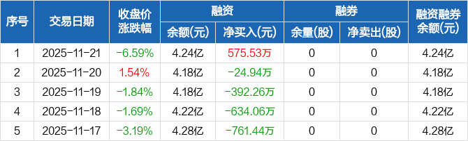 鸿日达:融资净买入575.53万元,融资余额4.24亿元(11-21)