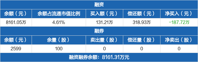 融资方面,当日融资买入131.21万元,融资偿还318.93万元,融资净偿还187.72万元。融券方面,融券卖出0股,融券偿还0股,融券余量100股,融券余额2599元。融资融券余额合计8161.31万元。