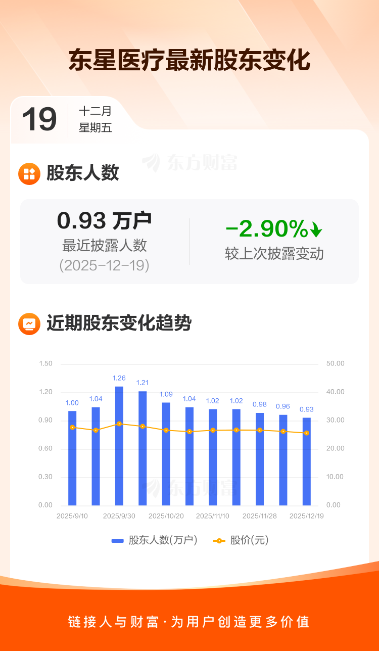 东星医疗最新披露数据显示,截至12月19日公司股东户数为9304户,较上期(2025年12月10日)减少278户,降幅为2.90%。户均持有流通股数量由上期的7113股上升至7326股,户均持股金额由上期的18.60万元增加至18.76万元。