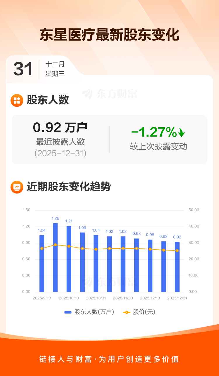 东星医疗最新披露数据显示,截至12月31日公司股东户数为9186户,较上期(2025年12月19日)减少118户,降幅为1.27%。户均持有流通股数量由上期的7326股上升至7420股,户均持股金额由上期的18.76万元减少至18.75万元。