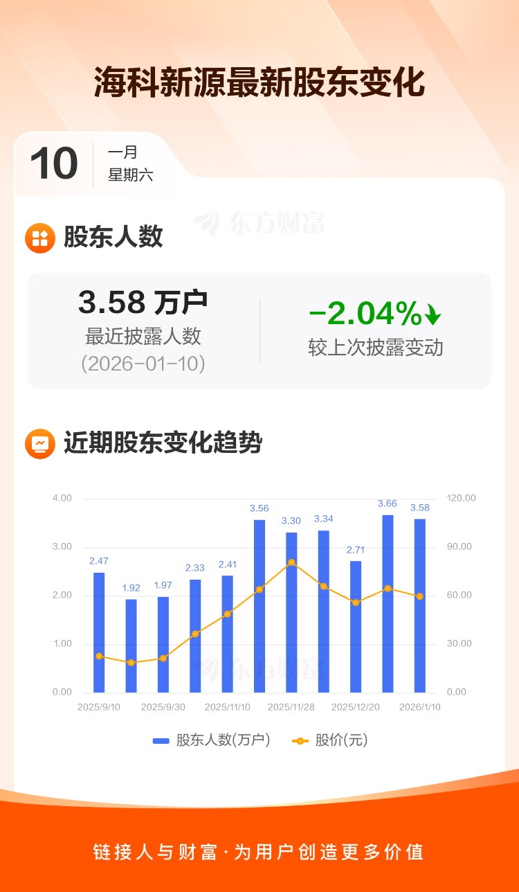 海科新源最新披露数据显示,截至1月10日公司股东户数为3.58万户,较上期(2025年12月31日)减少746户,降幅为2.04%。户均持有流通股数量由上期的2326股上升至2374股,户均持股金额由上期的14.99万元减少至14.12万元。