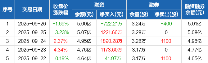 富乐德:融资净偿还722.21万元,融资余额5亿元(09-26)