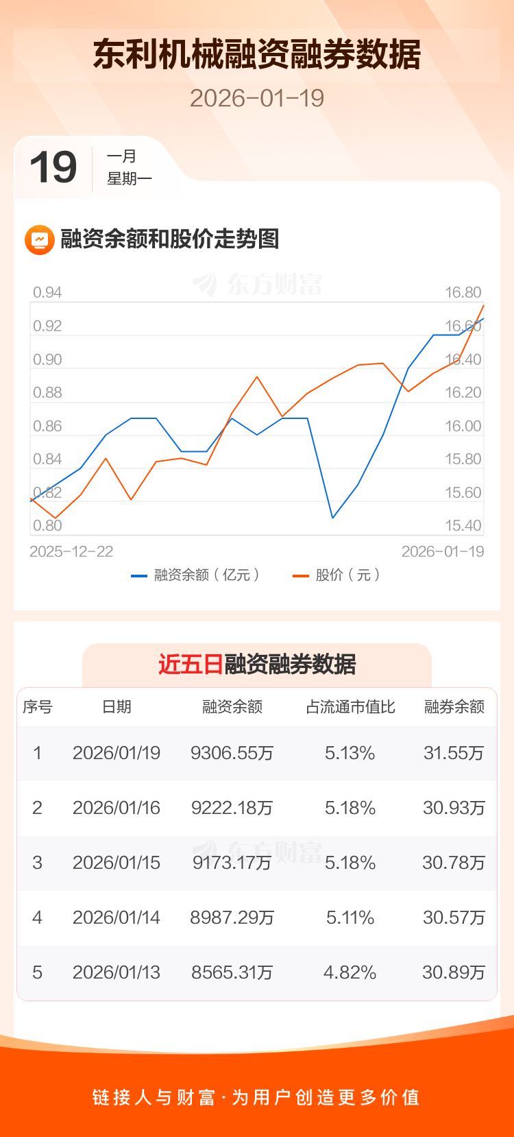 交易所最新数据显示,东利机械于2026年1月19日获融资买入660.25万元,融资偿还575.88万元,当日融资净买入84.37万元。目前,该股融资余额9306.55万,占流通市值比例为5.13%。