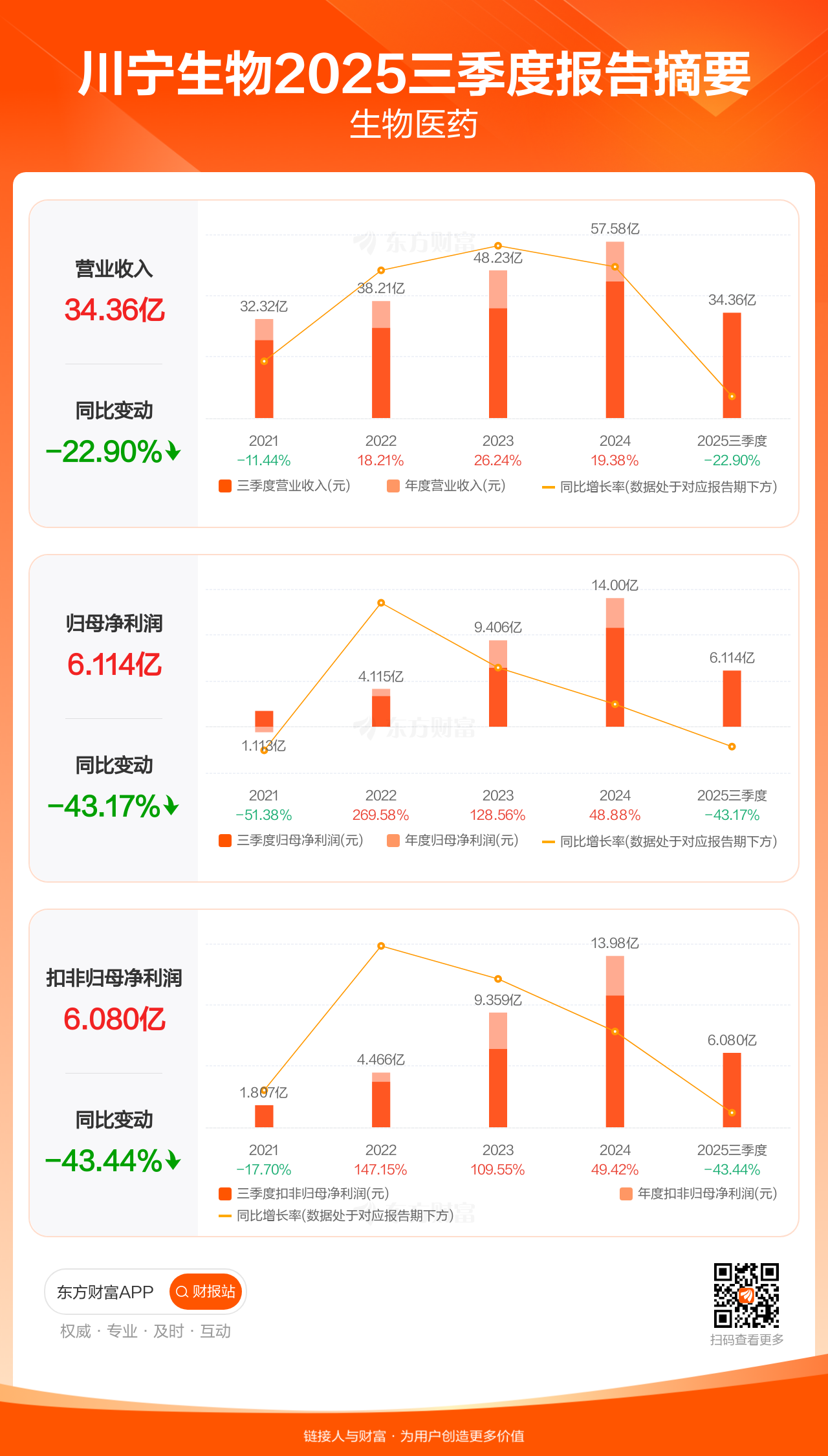 川宁生物10月28日发布2025年三季报显示,公司前三季实现营业收入34.36亿元,同比下滑22.90%;归母净利润6.11亿元,同比下滑43.17%;扣非归母净利润6.08亿元,同比下滑43.44%。