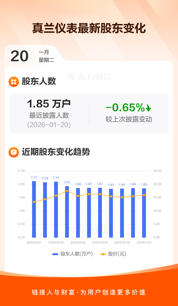 真兰仪表最新披露数据显示,截至1月20日公司股东户数为1.85万户,较上期(2026年1月9日)减少120户,降幅为0.65%。户均持有流通股数量由上期的5473股上升至5509股,户均持股金额由上期的8.48万元增加至8.80万元。
