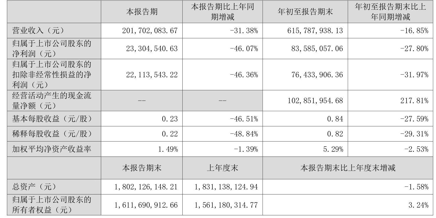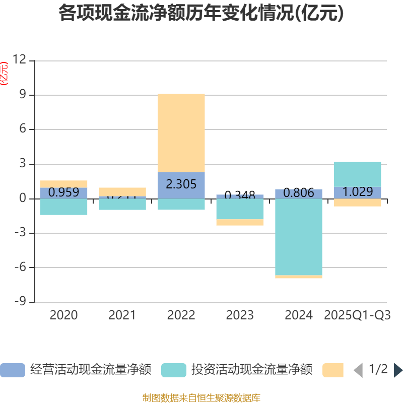 2025年前三季度,公司经营活动现金流净额为1.03亿元,同比增长217.81%;筹资活动现金流净额-6756.43万元,同比减少1794.3万元;投资活动现金流净额2.15亿元,上年同期为-5.61亿元。