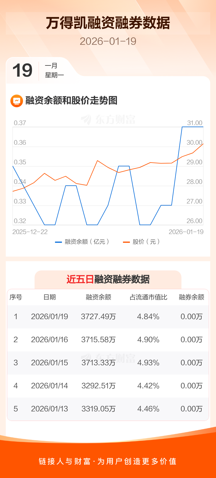 交易所最新数据显示,万得凯于2026年1月19日获融资买入436.01万元,融资偿还424.10万元,当日融资净买入11.91万元。目前,该股融资余额3727.49万,占流通市值比例为4.84%。