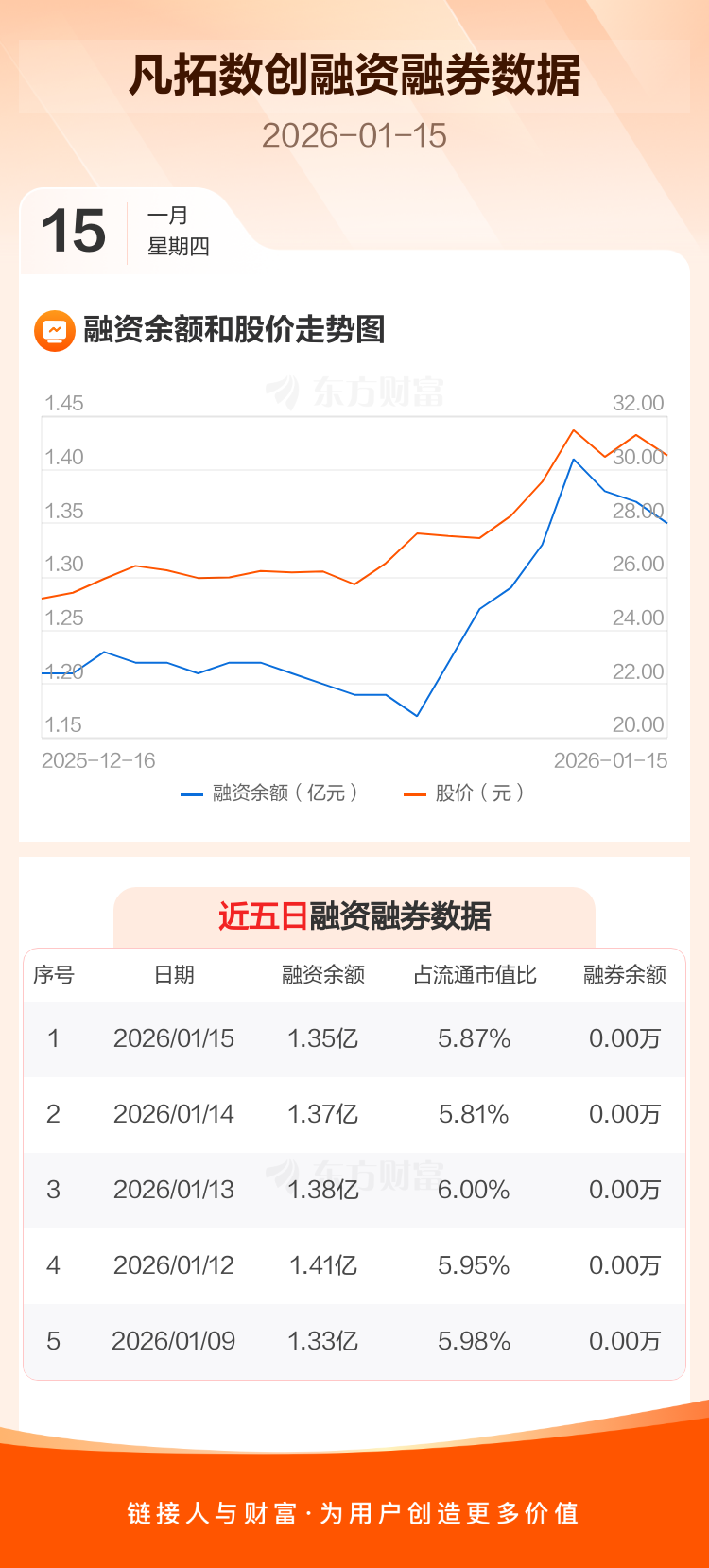 交易所最新数据显示,凡拓数创于2026年1月15日获融资买入1442.34万元,融资偿还1642.43万元,当日融资净偿还200.09万元。目前,该股融资余额1.35亿,占流通市值比例为5.87%。