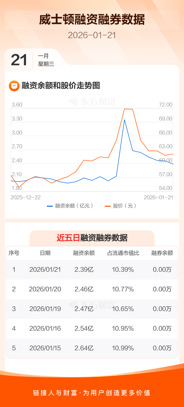 交易所最新数据显示,威士顿于2026年1月21日获融资买入2394.92万元,融资偿还3154.69万元,当日融资净偿还759.77万元。目前,该股融资余额2.39亿,占流通市值比例为10.39%。