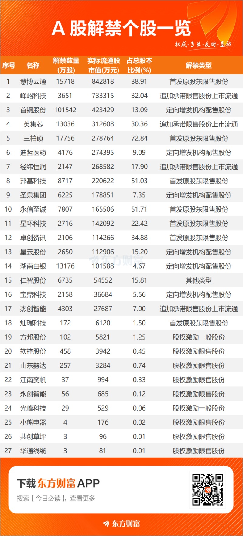 下周一27股解禁 慧博云通、峰岹科技解禁市值居前