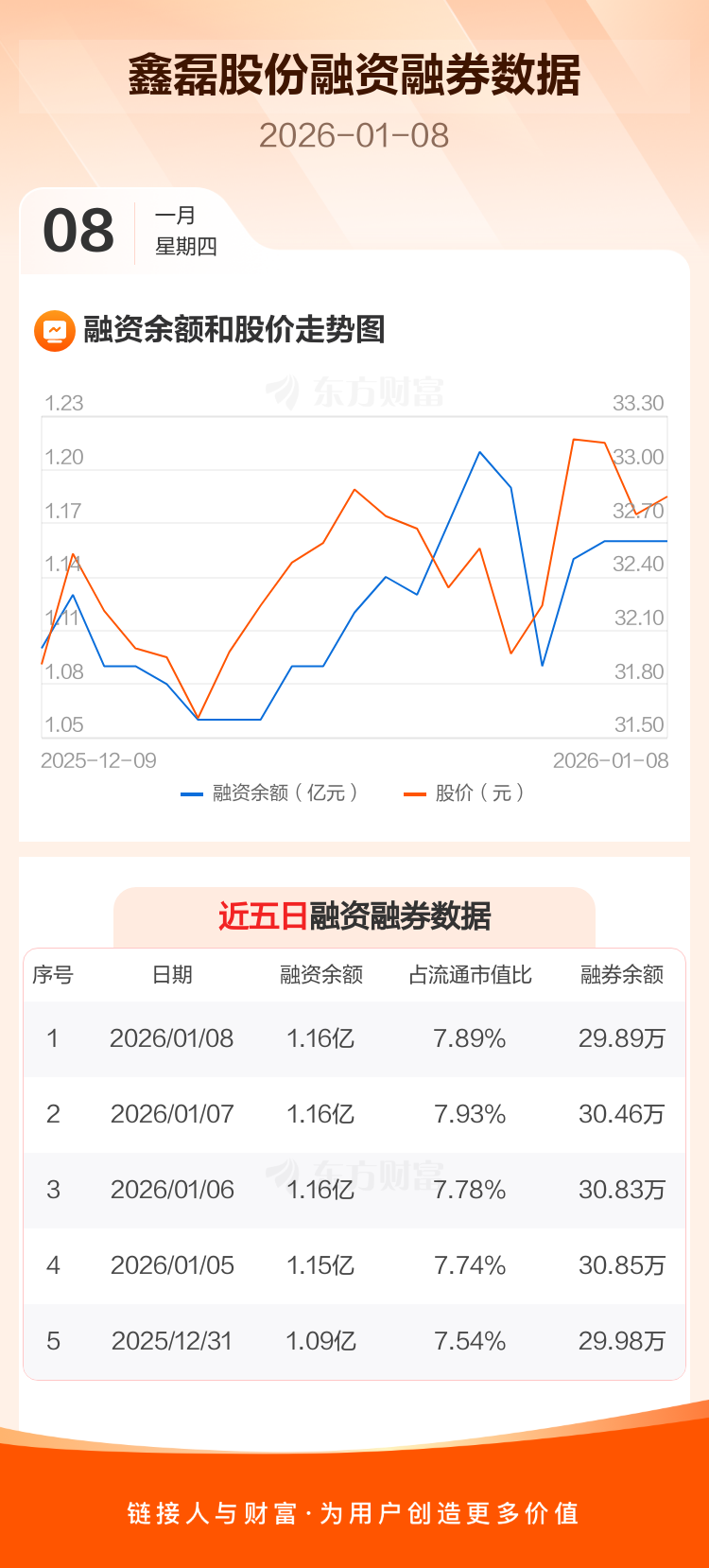 交易所最新数据显示,鑫磊股份于2026年1月8日获融资买入259.10万元,融资偿还283.60万元,当日融资净偿还24.5万元。目前,该股融资余额1.16亿,占流通市值比例为7.89%。