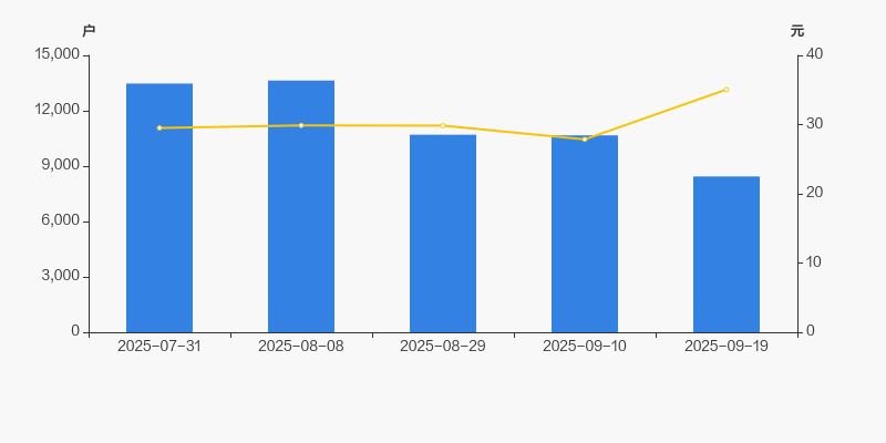 自2025年8月8日以来,公司股东户数连续3期下降,截至目前减幅为38.10%。2025年8月8日至2025年9月19日区间股价上涨17.37%。