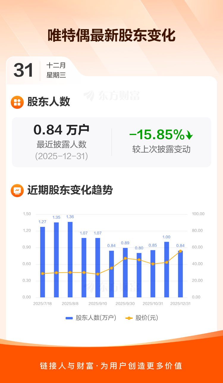 唯特偶最新披露数据显示,截至12月31日公司股东户数为8374户,较上期(2025年11月20日)减少1577户,降幅为15.85%。户均持有流通股数量由上期的9388股上升至1.12万股,户均持股金额由上期的39.39万元增加至61.86万元。