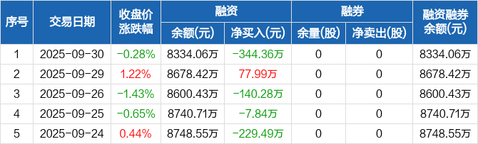 豪江智能:融资净偿还344.36万元,融资余额8334.06万元(09-30)