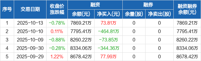 豪江智能:融资净买入73.81万元,融资余额7869.21万元(10-13)