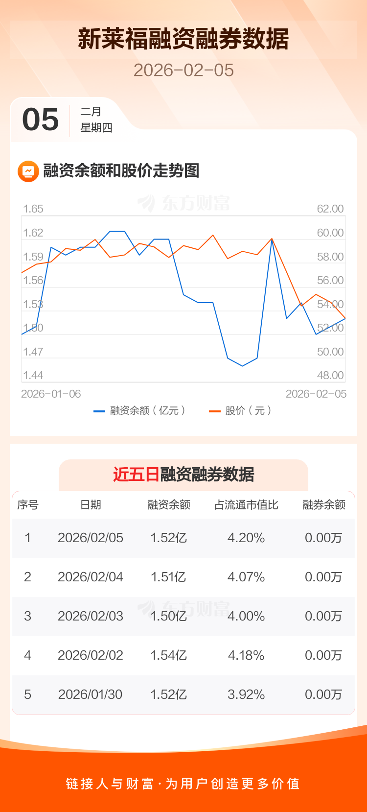 交易所最新数据显示,新莱福于2026年2月5日获融资买入700.69万元,融资偿还593.52万元,当日融资净买入107.16万元。目前,该股融资余额1.52亿,占流通市值比例为4.20%。