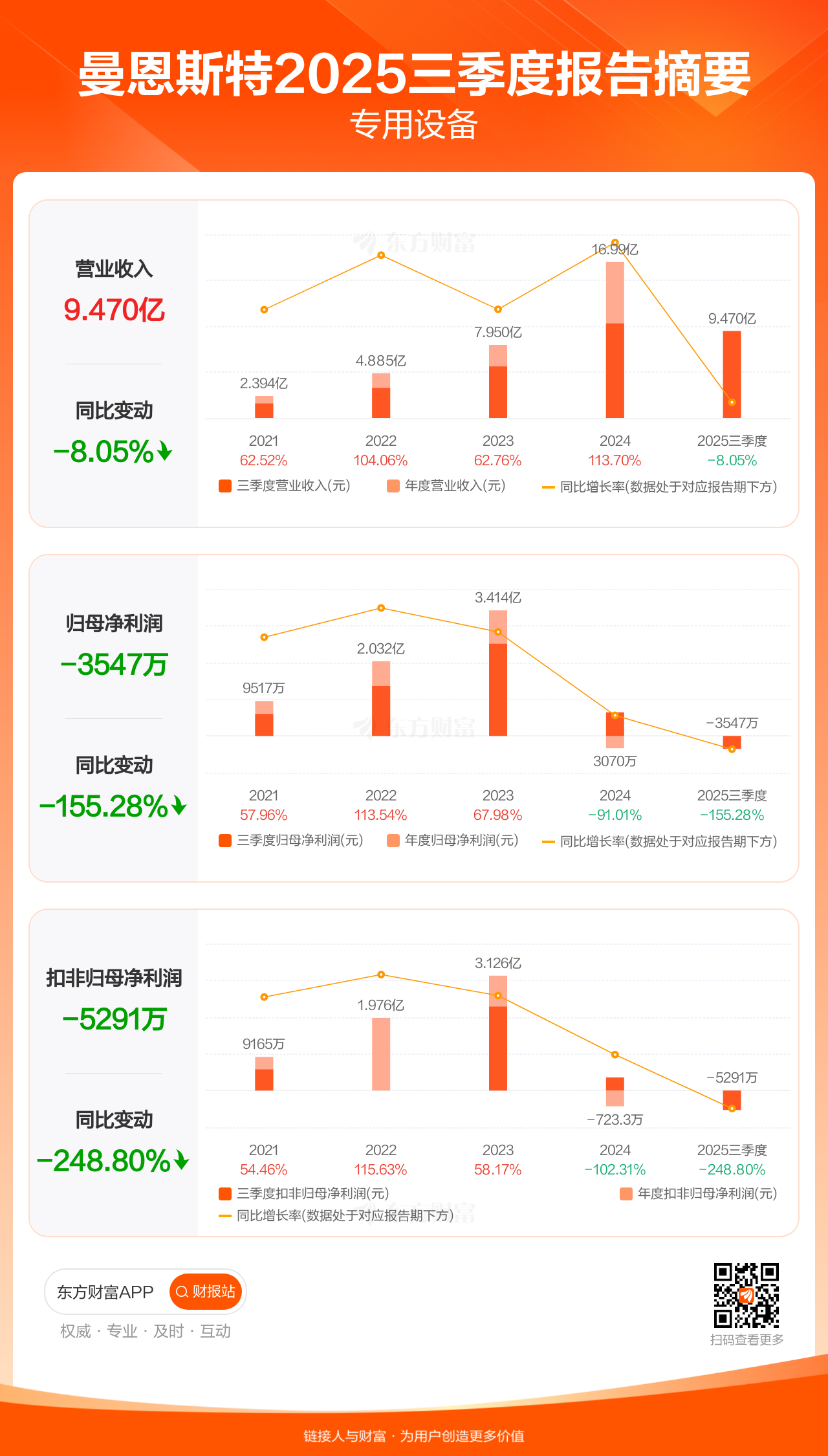 曼恩斯特10月29日发布2025年三季报显示,公司前三季实现营业收入9.47亿元,同比下滑8.05%;归母净利润-3546.66万元;扣非归母净利润-5291.07万元。