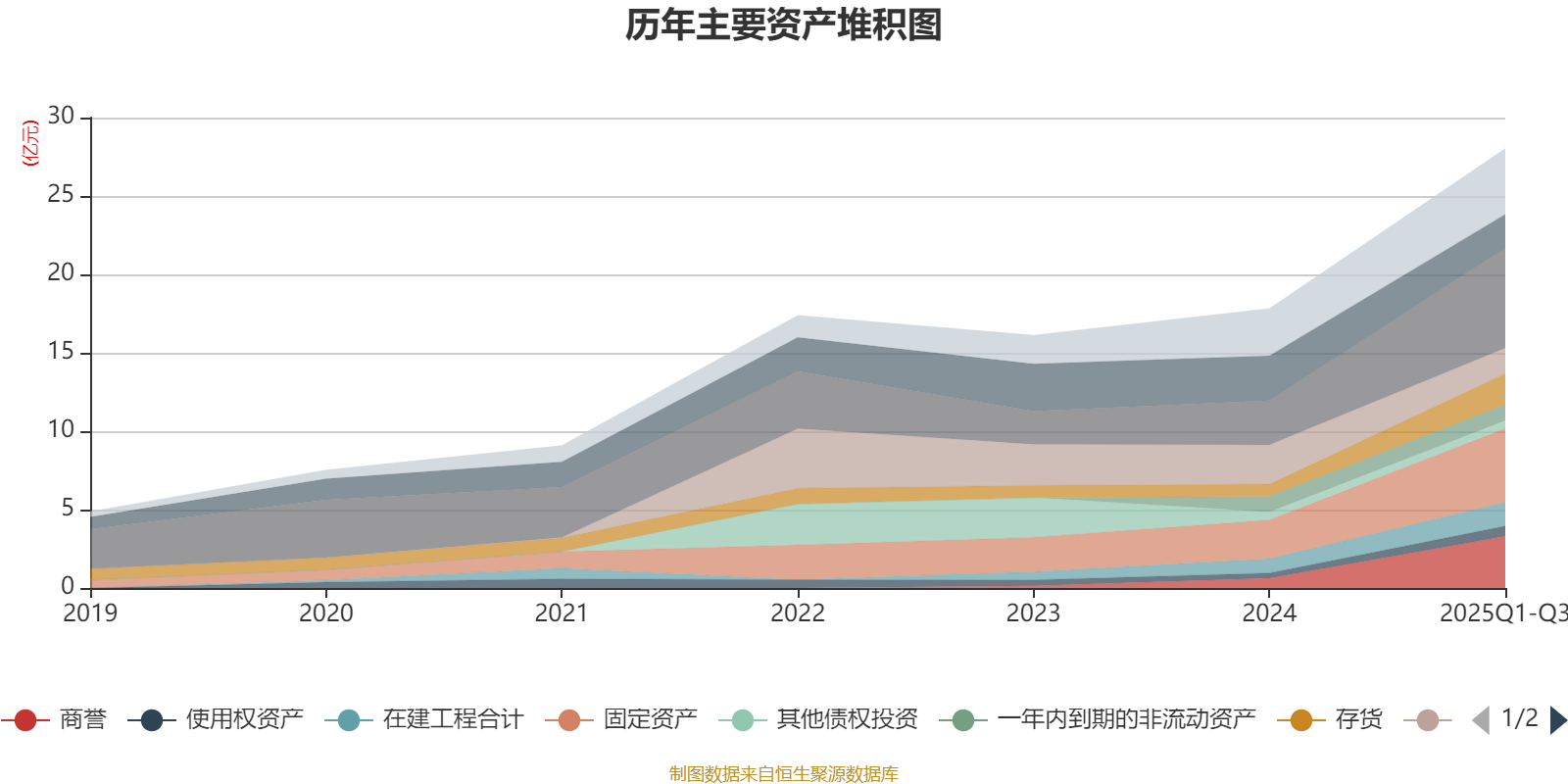 资产重大变化方面,截至2025年三季度末,公司货币资金较上年末减少24.41%,占公司总资产比重下降8.35个百分点;交易性金融资产合计较上年末减少35.75%,占公司总资产比重下降8.33个百分点;商誉较上年末增加428.89%,占公司总资产比重上升8.25个百分点;应收票据及应收账款较上年末增加126.2%,占公司总资产比重上升6.94个百分点。